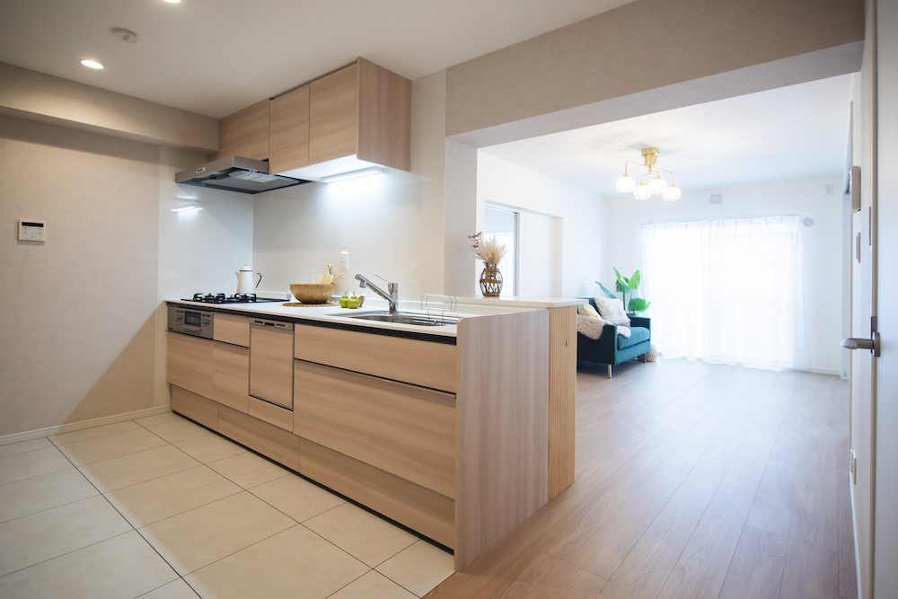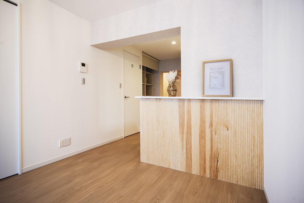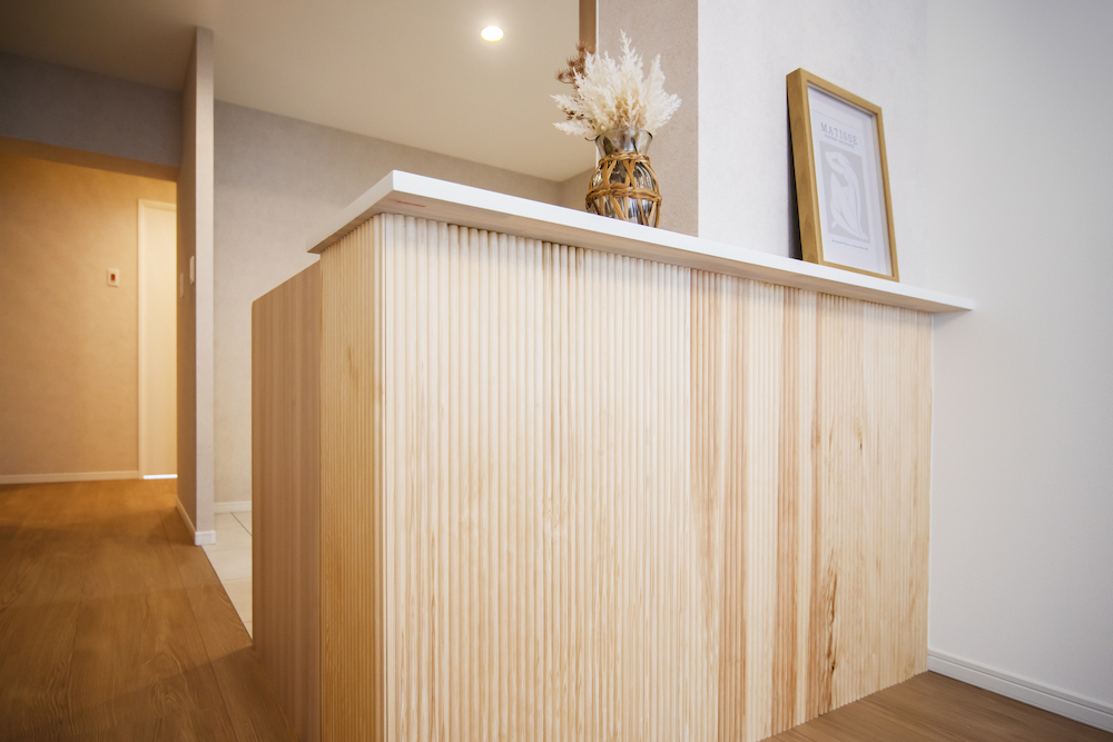 キッチンカウンターには、北欧の質の高い木材パネルである『ソルミ』を採用。