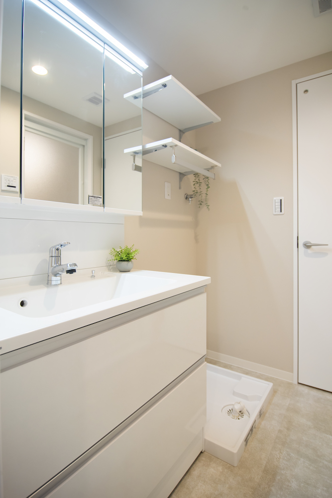洗面台は、収納ミラーで機能的に整理して使えるように。